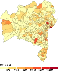 As estatísticas por município da Bahia, até 01 julho de 2020, indicam abaixo aqueles com mais casos confirmados:[6]