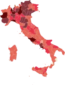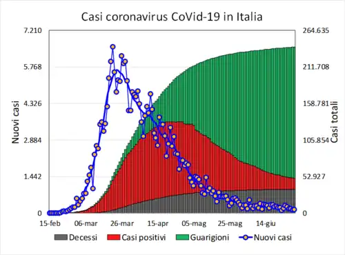 Em 9 de março de 2020, a Itália ampliou o estado de quarentena, e tomou medidas mais drásticas para evitar a expansão do surto. As medidas incluem restrições gerais de viagem, proibição de eventos públicos, fechamento de escolas e espaços públicos, como cinemas, e suspensão de serviços religiosos, incluindo funerais ou casamentos.[9] No dia 18 de março, a Itália teve seu maior número de doentes em 24 horas; foram mais de 4.200 infectados. No mesmo dia também foi contabilizado o maior número de mortes em 24 horas, com 475 mortes.[10] No dia 27 de março, o governo italiano divulgou que 919 pessoas haviam morrido, batendo outro recorde de fatalidades no país.[11] No dia seguinte, o número de mortos na Itália ultrapassou dez mil mortes, após registrar 889 novas fatalidades.[12] A partir do começo de abril, contudo, o aumento no número de mortos começou a cair em boa parte do território italiano. Medidas tomadas pelo governo, como o distanciamento social, foram apontadas como alguns dos motivos do declínio em fatalidades diárias.[13]