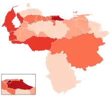 ![]() Número de casos confirmados na Venezuela (a partir de 3 de Abril e até 24 de Junho de 2020): <20 casos 20–39 casos