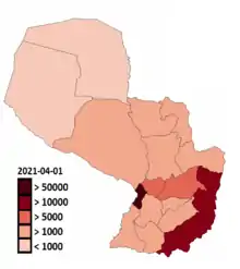 ![]() Departamentos com casos confirmados ≤1000 confirmados 1000–4999 confirmados ≥5000 confirmados | |