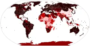 ![]() Mortes confirmadas de COVID-19 por país e território do Mundo (em 2 de maio de 2024): Países com casos confirmados e ao menos 1 morte relatada Países com casos confirmados, mas nenhuma morte relatada Sem morte relatada, sem população ou sem dados disponíveis | |