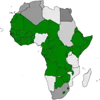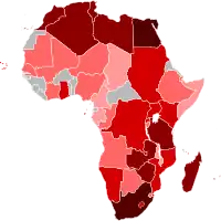 ![]() Pandemia de gripe A de 2009 em África 100+ mortes confirmadas 50+ mortes confirmadas 10+ mortes confirmadas 5+ mortes confirmadas 1+ mortes confirmadas sem mortes confirmadas | |