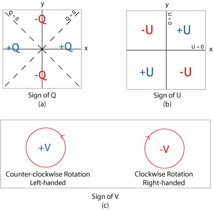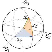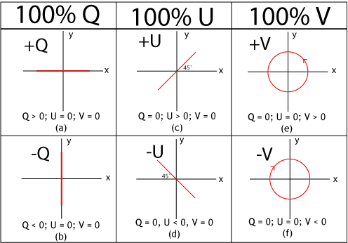 onde é a intensidade total, é a intensidade da polarização circular, e é a intensidade da polarização linear. A intensidade total de polarização é , e orientação e sentido de rotação são dados por: