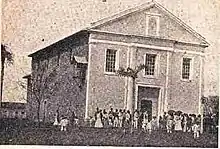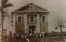 Servia de Matriz uma Eremita a Capelhinha construida de maderas, muito mal construida, e em pessimo estado e suponho eu ser o primeiro que celebrei a primeira Missa na Eremita, e não me consta que fosse bensida; e por ver o mao estado em que se achava não procurei a provizão para Benzer-a; Existia nella uma imagem de barro venerado como padroera; mas vendo a imperfeição da mesma imagem que pela sua enperfeição não podia ecitar devoção alguma; e nem me constava se era benta não procurei benzer-la por ser invalida a benção por ser de barro e imperfeita;[14] [...] En vista pois do mao estado da Matriz dei providencia para uma nova Matriz aprir o alicerce da Capella mor, depois de pilada a taipa atte uma certa altura conheci que a terra não dava para ser levantada precisava de pessoas que tivesse conhecimento d'officio de pilar terra levantar parede estes não havia nesta Freguesia, consultei com as primeiras pessoas para se levantar a nova Matriz de parede de pedra e cal visto ser muito facil a pedra nesta Freguezia; como de facto convierão que se abbandonasse a taipa e se construisse a nova Matriz de pedra e cal, foi dando alguma providencia para aprontar o material neste tempo que se ia aprontando o material desandava a Capella que foi o desabalo a vinte nove de Junho de mil oitocentos cinquenta e oito ano, [...][15]