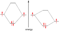 Neste diagrama, os elétrons que estão no orbital molecular de mais alta energia chama-se HOMO (High Occupied Molecular Orbital) e o orbital vazio de menor energia, localizado logo acima se chama LUMO (Low Unoccuppied Molecular Orbital). A função de onda molecular se exprime como produto de funções orbitais, cada uma descrevendo probabilisticamente a observabilidade posicional de um elétron, ou no máximo dois que possuam spins opostos.[16]