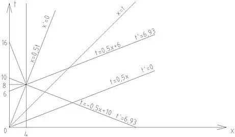 No gráfico abaixo, a trajetória do gêmeo A é representada pela reta x'=0 até uma distância de 4 anos luz da terra, com metade da velocidade da luz. A partir daí, ele inverte sua velocidade e retorna à terra, o que ocorre após 16 anos no referencial terrestre. Como A esteve em movimento no primeiro trecho da viagem, ele computa um tempo menor (t'=6,93 anos). O mesmo na viagem de volta, portanto no reencontro terá envelhecido 13,86 anos.