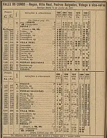Horário da Linha Corgo em 1913, onde Tourencinho aparece com a categoria de estação.