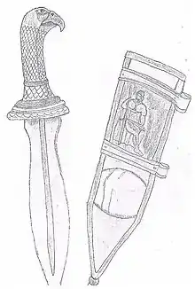 Quanto à empunhadura, destacava-se pela riqueza da ornamentação, ostentando pomos que podiam consistir em prótomos de cabeça de animal , tipicamente de águia (há um exemplar pontual de uma águia bicéfala[8]), ou bilobados, também chamados pomos de "língua de carpa", assim denominados porque, em vez de rematar num pomo (o chamado capulus) esférico ou em pinha, terminavam com um remate que podia lembrar uma semilua; dois globos lado-a-lado; duas antenas; ou duas volutas retorcidas.[7][9]