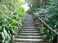 O parque está situado em uma encosta inclinada, de forma que possui três planos distintos ligados por escadas rústicas unindo os três platôs.