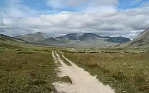 Os picos de Rondane, visto do sul. O Storronden e o Rondslottet são os primeiros dois à direita. A parte esquerda do maciço montanhoso é Smiubelgen ("a Forja").