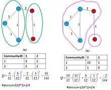 Particionamento mínimo corte no entanto falha quando o número de comunidades a ser particionado, ou o tamanho das partições são desconhecidas. Por exemplo, otimizando o tamanho do corte para grupos de tamanho qualquer coloca todos os vértices na mesma comunidade. Além disso, o tamanho do corte pode ser a coisa errada a minimizar uma vez que uma boa divisão não é apenas aquele com pequeno número de arestas entre as comunidades. Isso motivou o uso da Modularidade (Q) [9] como uma métrica para otimizar e balancear uma partição de grafo. O exemplo na figura 3 ilustra 2 instâncias do mesmo grafo de modo que em (a) modularidade (Q) representa a métrica de particionamento e em (b), proporção de corte representa a métrica de particionamento. Entretanto, sabe-se que Q sofre um limite de resolução, produzindo resultados duvidosos quando está lidando com comunidades pequenas. Neste contexto, Surprise[10] foi proposta como uma alternativa de aproximação para a avaliação de qualidade de uma partição.