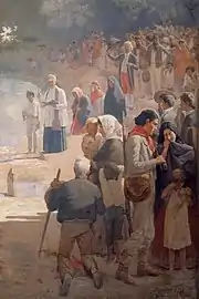 Ainda do lado direito da tela, está em destaque um pequeno grupo de pessoas. Entre elas, um homem de cabelos brancos ajoelhado sobre a terra, que olha para o padre com o corpo de costas ao observador.[5] Ao mesmo tempo, uma mulher, que usa roupas escuras e um lenço claro na cabeça, carrega uma criança no colo enquanto observa, com feição atenta, o que acontece do lado oposto da tela.[7] Uma segunda criança está de pé ao seu lado, com o corpo virado para ela. Perto delas, um homem e uma mulher parecem conversar, enquanto outra criança, de pé entre eles, leva as mãos ao rosto e chora.