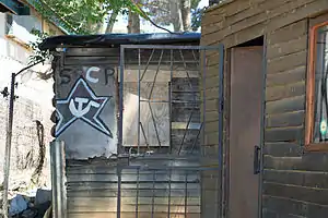 Grafite do SACP em Kayamandi, Stellenbosch, África do Sul. O adesivo redondo na janela à direita diz "Votela iANC" (Vote no ANC)".