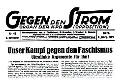 Em 1928, por instrução da Internacional Comunista, a liderança do KPD (constituída por Ernst Thälmann, Philipp Dengel e Heinz Neumann) deu uma virada à "ultra-esquerda" e concentrou sua luta em torno do "principal inimigo" - o SPD (tese do fascismo social). Os ex-presidentes do KPD, Heinrich Brandler e August Thalheimer, rejeitaram tal orientação. Também se opuseram à política de formar uma Oposição Sindical Revolucionária (RGO) ao lado dos sindicatos oficiais e, de modo geral, eram contrários à subordinação do KPD ao Partido Comunista da União Soviética. Brandler e Thalheimer defendiam uma frente unida, uma luta conjunta do KPD com o SPD contra o nacional-socialismo.