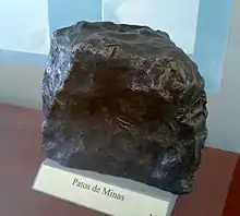 O meteorito encontrado em 1925 pesa 32 kg e é identificado como Patos de Minas (hexahedrite).[1]