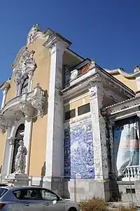 A fachada principal apresenta painéis de azulejos, em azul e branco, produzidos pela Fábrica de Sacavém, em 1922, representando cenas da História de Portugal com temas dedicados a Sagres, à Batalha de Ourique, à Ala dos Namorados na Batalha de Aljubarrota e ao Cruzeiro do Sul.