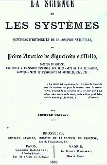 Pedro Américo também deixou diversos trabalhos teóricos em história, filosofia natural e belas artes, além de poesias e romances.[5] Contudo, essa produção é muito menos conhecida e estudada do que as suas pinturas, e seu valor tem sido questionado, mas se torna importante por revelar outras facetas de seu pensamento.[6][54] Seus primeiros ensaios literários foram poemas escritos quando estudava no Colégio Pedro II,[6] e seu texto mais relevante é A Ciência e os Sistemas: Questões de História e Filosofia Natural,[55] tese que defendeu na Universidade Livre de Bruxelas. Considerada a súmula de sua concepção filosófica, teve ótima acolhida e lhe garantiu o cargo de professor adjunto na Universidade.[56] A tese trata da evolução histórica das artes, da filosofia e da ciência, buscando uma universalidade renascentista de pensamento, e maneja confortavelmente uma grande riqueza de referências eruditas de várias áreas do saber.[54] A análise de Carolina Invernizio ressaltou sua oposição ao positivismo, uma filosofia muito influente na França e no Brasil de seu tempo,[6] e sua filiação mais direta, segundo identificação de Silvio Romero e José de Carvalho, é a vertente espiritualista do ecletismo francês, aproximando-se do pensamento de Victor Cousin, Jules Michelet e Edgar Quinet. Para ele a ciência, bem como a arte, deveriam ser isentas de obrigações particulares, abolindo-se dogmas, opiniões arbitrárias e sistemas exclusivistas, vendo como essenciais ao seu florescimento a livre investigação, a livre criação e o livre pensamento.[56] No prefácio, já advertia: