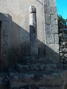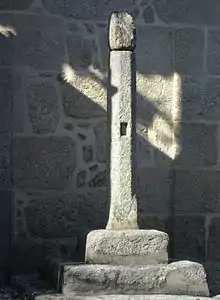 Edificado em granito, ergue-se sobre uma base com três degraus quadrangulares, sobre a qual assenta um fuste hexagonal, quase cilíndrico e no qual é possível observar cavidades para chumbos de corrente. Sobre a coluna apresenta-se um capitel simples, em forma de bola alongada.