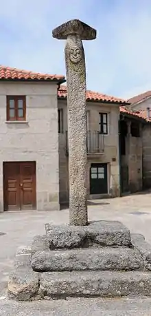 Apresenta-se com um simples esteio ao alto, muito próximo do habitual "tronco" do século XIII. Sobre uma base em três degraus, assenta uma coluna ovalada, sem base nem capitel, de aspecto sóbrio, tendo como única decoração uma carranca humana sorridente no fuste junto ao topo, rematado por uma laje triangular.