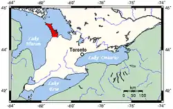 Mapa do sul do Ontário com a península Bruce a vermelho
