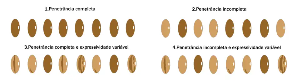 - Penetrância incompleta e expressividade variável: existem todas as variações, desde indivíduos que não possuem o fenótipo, até indivíduos que possuem o fenótipo em diferentes graus de expressividade.