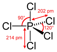Antigamente, se acreditava que o PCl5 em dissolução formava uma estrutura dímera, P2Cl10, mas esta ideia não concordava com medições feitas mediante espectroscopia de Raman.