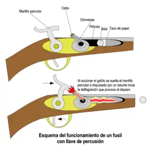 O mecanismo de percussão coexistiu inicialmente com o de pederneira, embora as vantagens deste sistema (resistência à umidade e maior cadência de tiro) tenham levado à conversão de muitos mosquetes de pederneira para percussão.[2] O mecanismo lançou as bases para o desenvolvimento posterior de cartuchos de metal, que integram espoleta, propelente e bala no mesmo estojo de metal.[4][5]