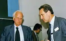 Peter Mittelstaedt (direita) e Carl Friedrich von Weizsäcker (esquerda) durante o Simpósio Internacional de Lógica Quântica, Colônia 1984