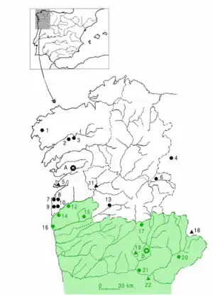 O conjunto de petróglifos galegos é um dos mais ricos e peculiares dentro do marco europeu e inclusive mundial.[3] A maior parte deles são localizados no sul da Galiza, na província de Pontevedra, na zona costeira que abrange desde a ria de Muros até à desembocadura do rio Minho, e concretamente no vale do rio Lérez, onde se conservam a maior parte das gravuras. Quanto mais nos afastamos deste lugar para o norte ou para o interior, encontramos uma menor densidade de gravuras e quase sempre nos vales dos rios.
