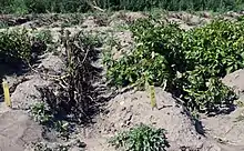 - O sacho deve ser aproveitado para criar um monte de terra ao pé das batateiras, evitando que o agente patogénico, pela água, atinge o tubérculo.[10]