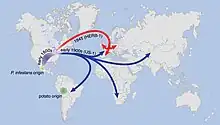 Seja como for, o míldio da batata, foi observada pela primeira vez nos Estados Unidos, perto da Filadélfia, em 1843, os ventos então espalharam os esporos e, em 1845, foi encontrado de Illinois a Nova Escócia e de Virgínia a Ontário. Surgiu pouco tempo depois na Europa, na França em 1844[23], na Bélgica em 1845. O vetor desta migração foi provavelmente tubérculos contaminados.[24] A espécie é geneticamente diversa[25][26][27][28] e altamente adaptável.[29] Contorna as defesas do seu hospedeiro e dos pesticidas sucessivamente inventados ou utilizados, dando origem a possíveis e periódicos ressurgimentos[30], que os fitopatologistas tentam acompanhar ou antecipar,[31] com o estudo de possíveis novas linhagens mais agressivas.[32] Por meio da Genômica(português Brasileiro) ou genómica(português europeu), tenta-se compreender os fatores de virulência envolvidos.[33] Assim, observou-se na Inglaterra e no noroeste da Europa o aparecimento na população de P. infestans de uma nova linhagem emergente, invasiva e agressiva chamada "13_A2"; novo genótipo mostrando uma alta taxa de polimorfismo de sequência e um nível notável de variações genéticas após infecção, incluindo genes efetores que se acredita desempenharem um papel importante na patogenicidade do parasita. Esta linha afeta cultivares de batata previamente resistentes.[34]