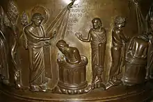 Exceto pelas duas últimas cenas que estão separadas por árvores que estão estilizadas na forma românica típica, mas cuja forma das folhas são todas diferentes.[31] A linha de terra ondulante contínua é executada por toda a bacia.[nt 2] Outras inscrições correm em volta das bordas inferior e superior da bacia. Enquanto o Batismo de Jesus é muito comumente descrito na arte medieval precoce, aquelas das outras figuras são assuntos muito raros na verdade,[nt 3] e este programa incomumente elaborado e erudito foi sem dúvida composto com assistência clara. Não reflete os precedentes iconográficos bizantinos; em vez disso relaciona-se intimamente com o interesse na tipologia e alegoria, da qual o influente contemporâneo nascido em Liège Ruperto de Deutz foi um expoente particular (porém Ruperto foi também um oponente particular do bispo da época, Oberto de Liège, que ficou do lado do imperador na Questão das investiduras).[34][35] A Mão de Deus que aparece no topo do batismo de Cristo (identificado como PATER) é uma aparição precoce de Deus, o Pai na arte ocidental; a Mão de Deus, mais típica do período, aparece nas cenas dos batismos de Cornélio e Cratão.