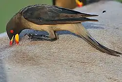 No entanto, seu alimento preferido é o sangue e, embora possam comer carrapatos inchados de sangue, também se alimentam dele diretamente,[11] bicando as feridas do mamífero até que o sangue escorra.[12] Qualquer que seja o resultado líquido, os mamíferos geralmente toleram os pica-bois.[11]