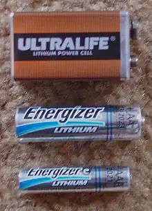 As pilhas de lítio são células primárias que têm ânodos de lítio metálico. As células de lítio produzem uma tensão cerca de duas vezes maior que a de uma bateria comum de zinco-carbono ou alcalina: 3 volts contra 1,5 volts, respectivamente.[1] Ao contrário da bateria de íon-lítio, elas não são recarregáveis.