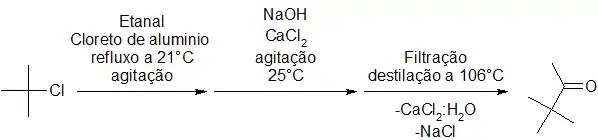 É produzido a a partir da reação de etanal com 2-Cloro-2-metilpropano, a reação é catalisada por cloreto de alumínio, o ácido é neutralizado com Hidróxido de sódio a reação do ácido com a base produz água e ela é absorvida pelo cloreto de cálcio, o Cloreto de alumínio fica inalterado e se é destilado o Pinacolona a 106 graus Celsius.
