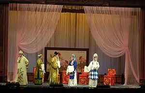 Os instrumentos musicais de acompanhamento consistem em dois grupos: instrumentos de corda e sopro e instrumentos de percussão. Os instrumentos de percussão incluem tambor, bangzi (梆子), gongo e pequenos címbalos, enquanto instrumentos de corda e sopro incluem banhu, erhu, zhonghu, dihu e alaúde de pipa. Instrumentos musicais ocidentais, incluindo baixo e instrumentos de sopro de metal, violoncelo e violino também foram adotados.[2]