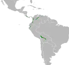 Distribui-se por sete países em bolsas isoladas (Costa Rica, Panamá, Equador, Colômbia, Peru, Venezuela e Bolívia).
