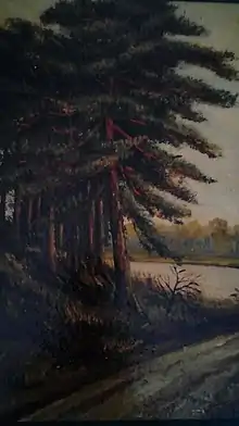 Trabalhando principalmente em aquarela, Hitler usou o meio para expressar seu amor pela pintura e pela arquitetura[22]. A pintura mostra seu estilo e domínio da aquarela para criar um delineamento rigoroso do edifício, mas à esquerda vemos duas árvores suaves para contrastar as linhas duras da casa. Em muitas das aquarelas de Hitler, o estudioso Charles Snyder observa a atenção detalhada às estruturas modestas cercadas por água e vegetação, [mas] a arquitetura é de primordial importância. Observe a vida das plantas, especialmente as folhas das árvores. As folhas são tipicamente borradas e manchadas com pouca consideração pela precisão ou realismo, geralmente usadas para enquadrar o objeto.[23] Uma pequena fonte entre duas árvores foi pintada à esquerda.