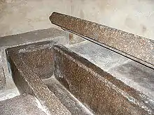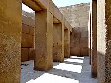 Duas entradas levam à câmara funerária, uma que abre 11,54 m acima da face da pirâmide e uma que se abre na base da pirâmide. Estas passagens não se alinham com a linha central da pirâmide, mas são deslocadas para o leste por 12 m. A passagem descendente inferior é esculpida completamente fora do rochedo, descendo horizontalmente, então ascendendo para juntar a passagem horizontal que conduz à câmara funerária.