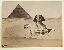 A esfinge, provavelmente construída a partir de uma formação rochosa usada para cortar os blocos da própria pirâmide, pode ter sido parte do complexo de Quéfren.[19]
