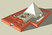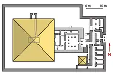 No centro do lado norte da pirâmide, há uma pequena estrutura que devia ter serviço como capela de oferendas, mas da qual restam hoje apenas poucos vestígios.[5] No canto sudeste, havia uma pequena pirâmide de culto, que media 5,2 x 5,2 metros na base e tinha uma altura de cerca de 4,5 metros - significativamente mais íngreme que a pirâmide principal, com uma inclinação de cerca de 60 °. A pirâmide do culto foi feita do mesmo material que a parede externa do complexo.[6]