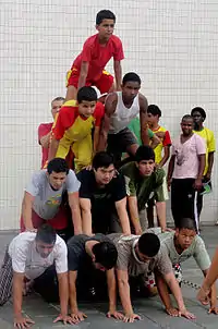 Pirâmide humana é uma das matérias avançadas de ginástica montada. Junto com uma torre humana, é demostrando na apresentação. Os figurantes da base se juntam como braços e joelhos e acumular os figurantes da mesma postura sobre a base. Desta forma, os figurantes realizam uma montagem de forma triangular que se torna fina para cima.