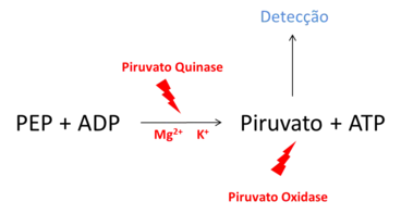 A detecção da atividade da piruvato quinase pode ser associada à concentração de produto formado. Um exemplo é a detecção de piruvato, um dos produtos da reação catalisada pela enzima, por colorimetria ou fluorimetria. Além da piruvato quinase, adiciona-se a piruvato oxidase à reação, que oxida o piruvato gerado produzindo cor (a λ = 570 nm) e fluorescência (a Ex/Em = 535/587 nm).[2]