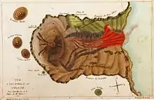| “ | L’Enclos est un rempart qui entoure le Volcan de trois côtés, il a à peu près la forme d’un fer à cheval, au sommet duquel serait la Montagne du Volcan, de la figure d’un cul de chapeau; là, sa largeur est environ de cinq quarts de lieue, s’écartant irrégulièrement en descendant vers la mer par une pente rapide | ” |