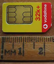 O cartão inteligente UICC consiste em circuitos de CPU, ROM, RAM, EEPROM e I / O. As primeiras versões consistiam no cartão inteligente de tamanho integral (85 × 54 mm, ISO / IEC 7810 ID-1). Logo a corrida para telefones menores exigiu uma versão menor do cartão. O cartão foi cortado para 25 × 15 mm (ISO / IEC 7810 ID-000), conforme ilustrado.
