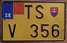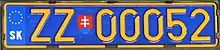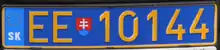 - Em 1 de maio de 2004, a Eslováquia ingressou na União Europeia. A fim de harmonizar a aparência visual das placas do país com o restante da UE, o brasão eslovaco foi substituído pela chamada "eurobanda", uma barra azul vertical com a representação da bandeira europeia.[3] O código do país, SK, foi inserido na eurobanda. O número 0 e a letra O também foram diferenciados, o numeral é cortado por um risco, de forma semelhante à fonte alemã FE-Schrift, utilizada em vários países.