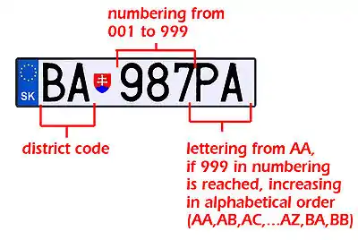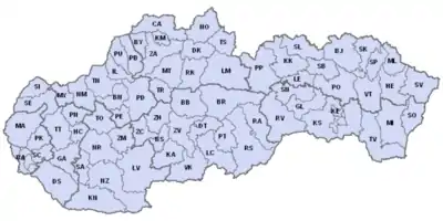 Existem 79 distritos na Eslováquia . Em 69 deles, o distrito recebe o código derivado no nome de sua principal cidade, incluída no distrito. Duas cidades, a capital Bratislava e Košice (KE), dividem-se em 5 e 4 distritos, respectivamente. Este fato não se reflete nas placas, apenas um código é usado. Além disso, Košice-okolie (KS) compreende uma área em torno de Košice (excluída a cidade em si) enquanto mantém sua sede na cidade. Cada distrito recebe pelo menos um código. Dez cidades, incluindo oito sedes da região ( kraj), recebem mais. Desde 18 de agosto de 2010, Bratislava registra placas com seu segundo código, BL.[5] O Ministério do Interior da República Eslovaca realizou uma pesquisa no Facebook como reação à insatisfação pública dos habitantes de Bratislava com o código BD pretendido anteriormente. Como as combinações do código BL serão esgotadas em breve, outra pesquisa no Facebook foi organizada em novembro de 2018. Os participantes foram convidados a votar no próximo código em três rodadas (duas semifinais e uma final). 89% optaram pelo código BT em vez de BE.[6] . Bratislava é o único okres a fazê-lo e permanecerá nessa posição por anos, já que Košice, a vice-campeã, só alcançou a série ML a partir de agosto de 2019.