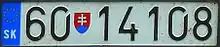 As placas de identificação de veículos na Eslováquia possuem distribuição regional pelos distritos (okres) e desde 1997, a matrícula (em eslovaco: EČV, evidenčné číslo vozidla) normalmente possui sete caracteres no formato XX-NNNLL, onde XX é um código de duas letras correspondente ao distrito, NNN é um número de três dígitos de 001 a 999 e LL são duas letras (atribuídas alfabeticamente). [1]