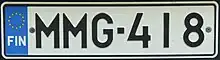 As Placas de identificação de veículos na Finlândia seguem um sistema alfanumérico introduzido em 1972, formado por três letras e três dígitos separados por um travessão (por exemplo, ABC-123) e não indicam o lugar de procedência do veículo. Os caracteres são pretos sobre fundo branco, com as medidas da placa de 442 mm de largura por 118 mm de altura.[1] O formato desde 2001 é comum ao das Placas de identificação de veículos na União Europeia, possuindo também a banda azul à esquerda com as estrelas em círculo da UE e o código do país, FIN.[2]