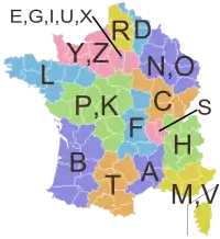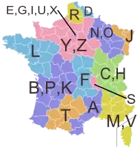 | ZE - ZG | Vendeia | ZH - ZK | Viena | ZL - ZP | Alto Viena | ZQ - ZT | Vosgos | ZU - ZY | Yonne |